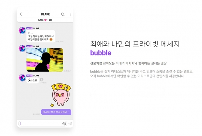 기존 채팅방에 한정됐던 소통 채널을 확장해 가상현실 속에서 아티스트와 교류할 수 있는 메타버스 공간을 제공할 예정입니다. 버블서비스는 플랫폼 기반의 팬덤 비즈니스로 우수한 아티스트를 영입하여 프라이빗 메시징 서비스를 제공하고 있으며 향후 플랫폼의 확장을 통해 메타버스 서비스까지 사업영역을 확대 추진 중 ---- 예를 들어 이 회사 플랫폼으로 연예인이 안녕 지연아 이런식으로 개인화 한. 급속도로 성장한 버블의 다음 목표는 메타버스다.