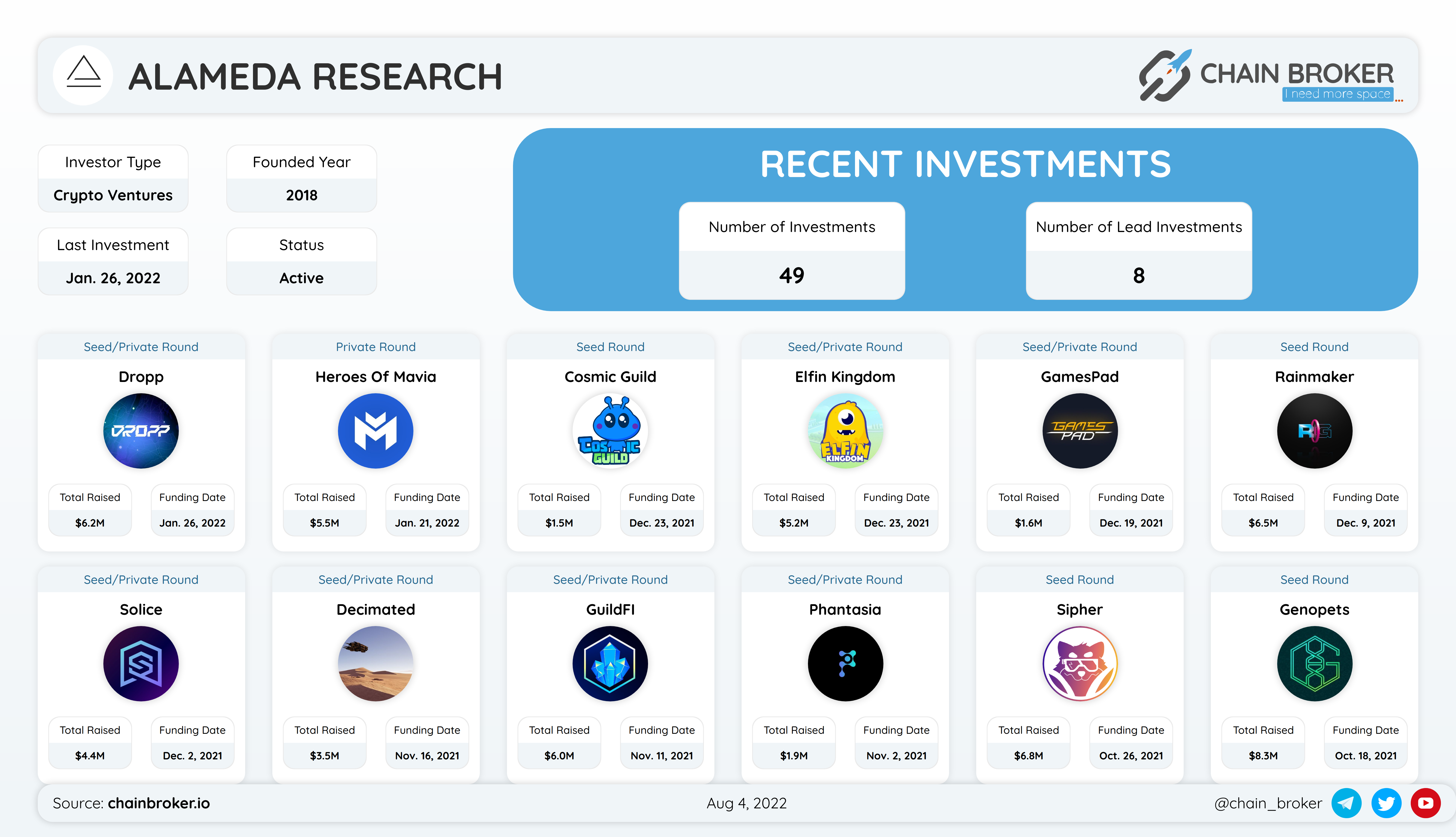 Alameda Research Fund Investments Portfolio Coins Funding Rounds Chain Broker